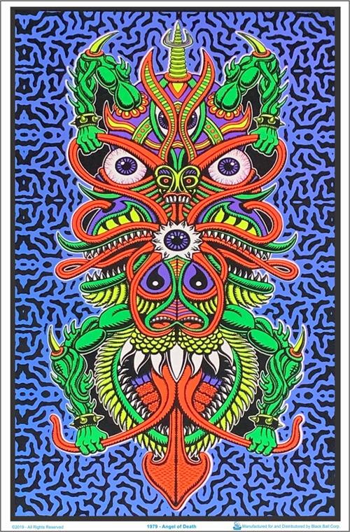 Add amazing colour to any space with this fantastic ANGEL OF DEATH BLACKLIGHT poster from our ART range. A Blacklight poster is printed with inks which fluoresce under blacklight bulb. The inks contain phosphors which cause them to glow when exposed to the ultraviolet light emitted from black light bulbs. They originate from the 1960s but are incredibly popular today for your psychedelic caves and glow-in-the-dark parties. We have the biggest range in Australia covering pop and cannabis culture, gothic and fantasy art, nature and music.