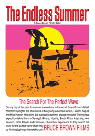 Released in 1966, The Endless Summer has been called the most influential surf movie ever made. Film-maker Bruce Brown followed two surfers; natural-footer Mike Hynson and shit-footer Robert August (with cameos by Miki Dora, Phil Edwards and Butch van Artsdalen), on a round-the-world trip, clocking Australia, New Zealand, Tahiti, Hawaii, Senegal, Ghana, Nigeria and South Africa. It’s an obvious premise by modern standards: by dipping from the northern hemisphere into the southern and back again, it’s possible to avoid winter altogether, thus creating an “endless summer”.