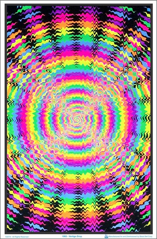 Add amazing colour to any space with this fantastic VERTIGO DROP BLACKLIGHT poster from our OPTICAL ILLUSIONS range. A Blacklight poster is printed with inks which fluoresce under blacklight bulb. The inks contain phosphors which cause them to glow when exposed to the ultraviolet light emitted from black light bulbs. They originate from the 1960s but are incredibly popular today for your psychedelic caves and glow-in-the-dark parties. We have the biggest range in Australia covering pop and cannabis culture, gothic and fantasy art, nature and music.